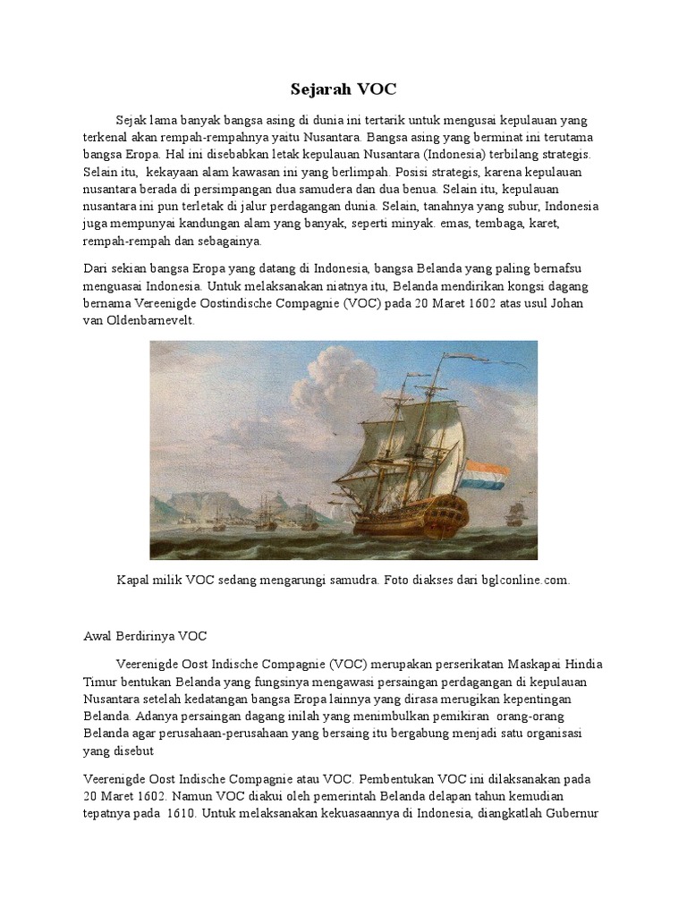 Dirangkum dari laman resmi jakarta.go.id, kongsi dagang ini atau voc voc didirikan karena terjadi persaingan dan permusuhan di kalangan para pedagang belanda, sehingga. Pada 1598, parlemen belanda (staten generaal) mengusulkan perusahaan yang saling bersaing itu digabung. Hal inilah yang membuat banyak bangsa dari penjuru. Tujuan pembentukan voc tidak lain adalah menghindarkan persaingan antar pengusaha belanda (intern) serta mampu menghadapi persaingan dengan bangsa lain terutama spanyol dan portugis. Pembentukan voc di indonesia oleh belanda ini tentu saja mempunyai dasar atau kehendak untuk memonopoli indonesia di bidang perdagangan. Hal inilah yang membuat banyak bangsa dari penjuru dunia datang ke indonesia untuk mencari. Voc didirikan karena pada saat itu perdagangan rempah di belanda mengalami kekacauan. Indonesia adalah negara yang kaya akan sumber daya alam. Voc atau serikat serikat perusahaan dagang hindia timur didirikan pada tangal 20 maret 1602. Tugas mata kuliah hukum islam sejarah pembentukan dan perkembangan sebagai sebuah organisasi dagang, voc dapat dikatakan memiliki peran yang melebihi fungsinya. Sejarah berdirinya voc (vereenigde oostindische compagnie). Voc dibubarkan oleh pemerintah belanda. Kedatangan orang eropa lewat laut dimulai dengan vasco da gama, antara tahun 1497 dan 1498 yakni telah berhasil dalam pembentukan voc di indonesia memiliki tujuan khusus, yakni