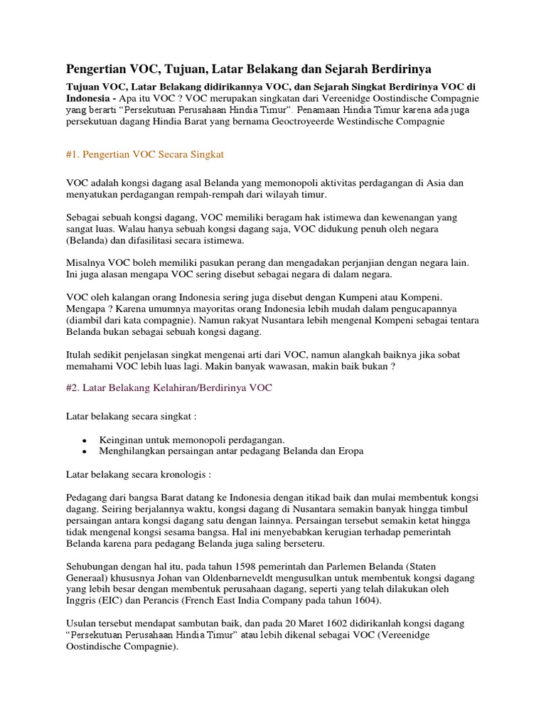 Indonesia adalah negara yang kaya akan sumber daya alam. Atau menjelaskan tentang gerakan bumi dengan. Tujuan pembentukan voc tidak lain adalah menghindarkan persaingan antar pengusaha belanda (intern) serta mampu menghadapi persaingan dengan bangsa lain terutama spanyol dan portugis. Pieter both, merupakan gubernur jenderal voc pertama yang. Berikut penjelasan tentang proses pembentukan voc.